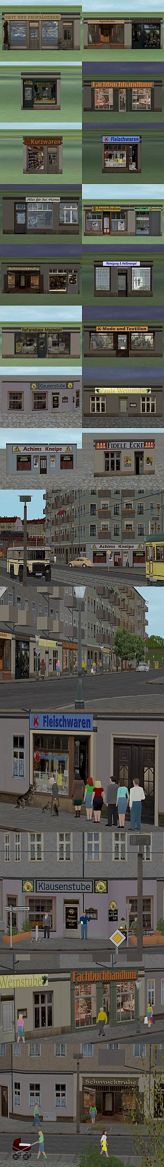 wesentlichen Merkmalen. Lieferumfang: OK_IX_L_Baecker_AF1: 8,22 m breites Bäckereimodul; mit Nebeneingang zu Wohnungen; OK_IX_L_Apo_Foto_AF1: 10,00 m breites Modul mit Apotheke und Fotoatelier; OK_IX_L_Buecher_AF1: 10,00 m breites Buchhandlungsmodul; OK_IX_L_Fische_AF1_Tx: 4,18 m breites Fischladen-Modul; das Fenster mit der Aufschrift HO ist mittels TexEx änderbar; OK_IX_L_Fleisch_AF1_Tx: 4,18 m breites Fleischwaren-Modul; der Namen des Ladens und das Ladenfenster sind mittels TexEx änderbar; OK_IX_L_Friseur_AF1_Tx: 10,00 m breites Doppel-Modul Jugendfriseur und Machmit-Zentrale ; die Namen der Läden sind mittels TexEx änderbar; OK_IX_L_HO_Herren_AF1_Tx: 8,14 m breites Modul Herrenbekleidung; die Namen des Ladens und Fenster mit Schriftzug HO mittels TexEx änderbar; OK_IX_L_Kurzwaren_AF1_Tx: 8,14 m breites Modul Kurzwarenladen; Namen des Ladens mittels TexEx änderbar; OK_IX_L_Mode_AF1_Tx: 10,00 m breites Modul Textilladen; der Name des Ladens mittels TexEx änderbar; OK_IX_L_Mode_AF1_Tx: 10,00 m breites Modul Textilladen; der Name des Ladens und das linke Schaufenster sind mittels TexEx änderbar; OK_IX_L_Reinigung_AF1: 6,60 m breites Modul Reinigung/Heißmangel; OK_IX_L_Schmuck_AF1: 10,00 m breites Modul Schmuckladen / Elektroladen; OK_IX_K_090_KS_AF1_Tx: Gaststätten-Modul für 90 Grad - Eckhaus ohne Vorbau; die Leuchtafel über der Eingangstür und die Tafel rechts der Speisenkarte sind mittels TexEx änderbar. OK_IX_K_055_V_AK_AF1_Tx: Gaststätten-Modul für 55 Grad - Eckhaus mit Vorbau;die Leuchttafel über der Eingangstür und die Bierreklamen in den Fenstern können mittels TexEx geändert werden. OK_IX_K_125_FE_AF1_Tx: Gaststätten-Modul für 125 Grad - Eckhaus; die Leuchttafel und die Bierreklamen können mittels TexEx geändert werden. OK_IX_K_VH_PW_AF1_Tx: 10,00 m breites Gaststätten-Modul für Vorder– bzw. Hinterhaus; die Leuchttafel über der Eingangstür kann mittels TexEx geändert werden. Modelle werden gefunden unter Immobilien\Andere. Die Beschreibung der Modelle sind der beiliegenden pdf zu entnehmen. Der Autor dankt Herrn Klaus Dolling, Erfurt für das
