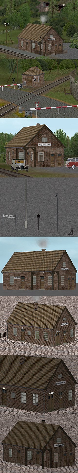 Beschreibung: Der Modellsatz Bahnhof Lübeck-Pöppendorf enthält die Modelle der kleinen, bei Streckenkilometer 5,0 (gerechnet ab Bhf. Travemüde Strand) gelegenen Zwischenstation Lübeck-Pöppendorf) in einer gealterten Version der Modelle für Epoche III bis V. Auf Wunsch von Usern fügt der Autor eine Gebäudevariante ohne Bhf-spezifische Beschriftungen zur Erweiterung der Verwendungsbreite bei. Die Neubau-Ausführung von 1935 (Epoche II) dieses Modellsatzes erscheint zeitgleich als V60NAF10058 bzw. AF100058. Das Bahnhofsgebäude enthielt einen Dienstraum mit Stellwerk und Fahrkartenverkauf, eine Güterabfertigung, einen Warteraum und eine Toilettenanlage untergebracht; weitere Räume dienten der Unterbringung des Lampen– und Kohlenvorrats (Heizung). Später wurde Lübeck-Pöppendorf zum Haltepunkt abgestuft, ca. 1960 dann aufgelassen und verkauft. Das ehemalige Bahnhofsgebäude wird heute als Wohnhaus genutzt. Hinweis: Die folgende Stückliste enthält die Modelle, d.h. den Namen, mit dem Sie das Modell in EEP wieder finden und eine kurze Modellbeschreibung. EG_Poeppendorf_Ep_III_AF1 mit Zaunwinkel_AF1 und EG_Poeppendorf_n_Ep_III_AF1 mit Giebeltafel_AF1_Tx , Neutrale Version Zubehör Stationstafel_AF1_Tx Stationstafel „Lübeck-Pöppendorf“,