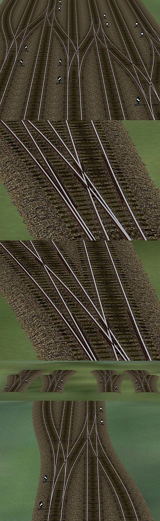 Weichensystem Holzgleis Set 3 3-Weg-Weichen asymmetrisch Weichenset mit eigenem Spline Das Set ist ab EEP6 bzw. EEP5 mit allen Plugins geeignet. Beschreibung: Das Set ist der weitere Ausbau des Weichensystems, es