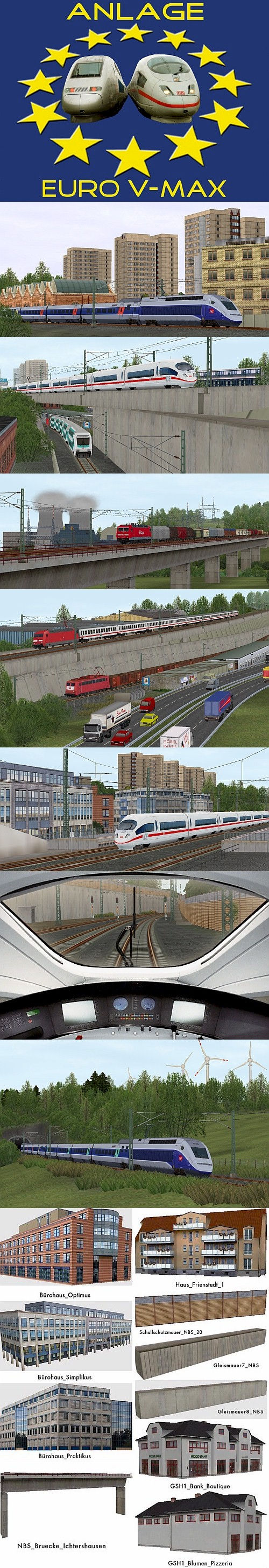 Zeitwende der Mobilität. Anlagenbeschreibung: Steigen Sie ein und lehnen Sie sich zurück, in einen ICE oder in einen TGV, vielleicht aber lieber einfach im IC oder im Regionalexpress, ganz wie Sie möchten. Fahren Sie z. B. auf den Führerstand eines Hochgeschwindigkeitszuges mit und lassen Sie die Landschaft mit bis zu 300 km/h an sich vorbei rauschen. Mit Euro-Vmax erleben Sie abwechslungsreichen, modernen Zugverkehr im kombinierten europäischen Verbund auf einer reinen Fahranlage. Zweck und Ziel dieser Simulation ist es, moderne Zuggattungen, Lokomotiven und Straßenfahrzeuge in einer relativ passenden Infrastruktur und Umgebung verkehren zu lassen. Ausgestattet wurde die Anlage hauptsächlich mit Modellen