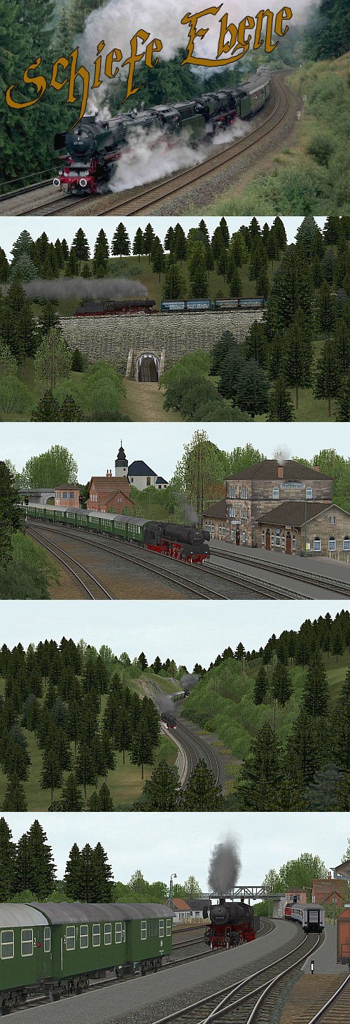 Anlage Schiefe Ebene hier einige Anlagenmotive: Die älteste Steilrampe Europas Herzlich Willkommen zu einer Reise in die Vergangenheit. Das Vorbild: Streckenführung: Knapp 160 Höhenmeter liegen zwischen den 7,6 km voneinander entfernt liegenden Bahnhöfen Neuenmarkt-Wirsberg und Marktschorgast. Die Rampe unterteilt sich in zwei unterschiedliche Abschnitte. Ihr unterer Teil ist im Gegensatz zum oberen Teil eher arm an Kunstbauten. Die Trasse führt nach 2 Kurven in eine über 1km lange, beidseits waldbestandene Gerade hinauf zur Blockstelle Streitmühle. Der zweite, obere Teil ist gebirgig. Die Trasse lehnt sich nach einer starken Linkskurve an den linken, teils felsigen Berghang des engen und steilen Streitmühlbachtales. Weiter windet sich der Schienenstrang in Kurven mit Radien von 400 bis 500 m über imposante Stützmauern aufwärts. Nach einer Linkskurve und einer anschließenden kürzeren Geraden läuft schließlich die Rampe am Westkopf des in einer starken Rechtskurve liegenden Bahnhofs Marktschorgast aus. Verkehrsmittel: 127 Jahre verkehrten auf der „Schiefen Ebene“ Dampflokomotiven, die dort in ihrer ganzen Imposanz und Ausdruckskraft zur Geltung kamen. Dem Betrachter wurde hier ihr optisches und vor allem akustisches Erscheinungsbild nachdrücklich vermittelt. Von unvergesslichen Klangerlebnissen, sowie gewaltigen Dampf- und Rauchpilzen, die aus den Schornsteinen der Zug- und Schiebelokomotiven schon von weitem eine Zugfahrt ankündigten, wissen heute nur noch Zeitzeugen zu berichten. Insbesondere durch die Schnellzuglokomotiven der Baureihe 01 vom Bahnbetriebswerk Hof die noch bis 1973 im Dienst standen, hat die „Schiefe Ebene“ ihren größten Bekanntheitsgrad erlangt. Technische Daten: Bauherr: Königlich Bayerische Staatseisenbahn (Quellen: EK-Verlag, Steffen Lüdecke: Die Schiefe Ebene) Die Umsetzung in die virtuelle Welt Nach etwa 1 Jahr Recherchen und 7 Monaten intensiver Anlagenbauzeit und Modellkonstruktion entstand die nun vorliegende virtuelle Version der „Schiefen Ebene“. Oberstes Ziel war die bestmögliche Umsetzung des