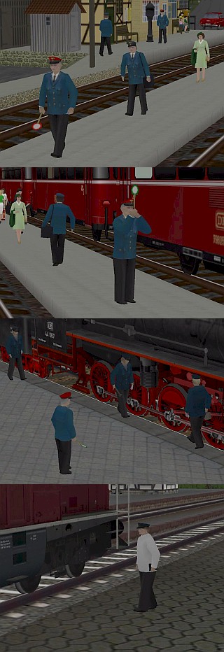 Gehendes DB-Personal Set 1 incl. Update Beschreibung: Das Set enthält gehendes Personal der Deutschen Bundesbahn, wie es auf den Bahnhöfen und Bahnbetriebswerken anzutreffen war. Einsatz: Ab Epoche III-IV Inhalt und Installation: Lieferumfang: 8 Modelle Resourcen\Rollmaterial\Figuren oder Andere: DB-Zugfuehrer_BH1.gsb Sounds/KONTAKT: Trillerpfeife_BH1.wav Hinweis: Die Modelle sind für den Einsatz auf einspurigen