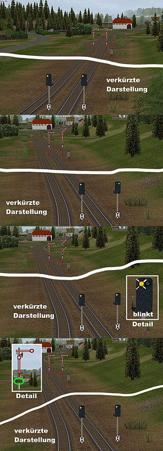 Einsatz ab EEP 5 PL 5/ EEP 6 Das Set besteht aus: BS1_Hf_Gruppe_1_mLVS__55.gsb (2 Flügel mit Lichtvorsignal) Beschreibung: Das Set enthält die Kombination eines mehrbegrifflichen Form-Hauptsignals mit einem Licht-Vorsignal. Hinweise: auch gelistet als BS1461 Trend Dieses Signal entstand als Userwunsch. Das Signal ist mehrbegriffig. Einsatz: Zum Einsatz kam diese Kombination oft als Einfahrt-Signal an Bahnhöfen oder Kreuzungspunkten mit mechanischen Stellwerken. Auf Grund des hohen Wartungsaufwandes der in der Regel 1000m entfernten mechanischen Vorsignale wurden diese nach und nach durch Licht-Vorsignale ersetzt. Diese Kombination ist auf Nebenstrecken auch heute noch anzutreffen. Hinweis: Diese Signale sind ab EEP 5 Plugin 5 und EEP 6 incl.
