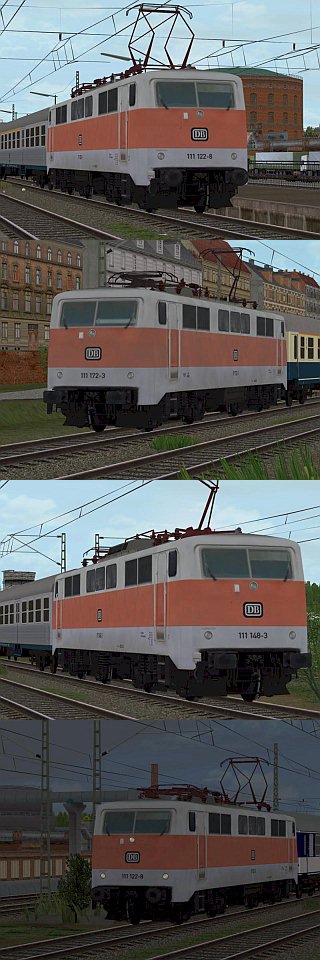 Im Set enthalten: Rollmaterial/Schiene/Lokomotiven DB_111-122-S-Bahn-EpIV_DB1-SK2.gsb Beschreibung: Die Baureihe 111 ist eine zwischen 1974 und 1984