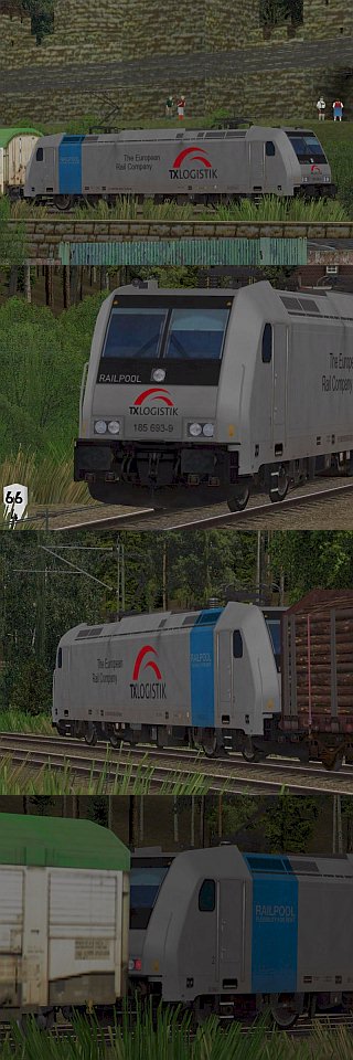 Im Set enthalten: Railpool_TXL_185-693-EpVI_DB1_SK2.gsb Installationspfad : Rollmaterial/Schiene/Lokomotiven Beschreibung: In diesem Set sind zwei Lokomotiven der Baureihe 185.2