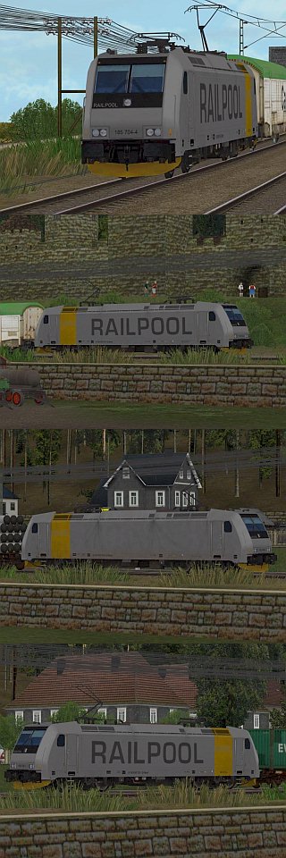 Im Set enthalten: Railpool_S_185-704-EpVI_DB1_SK2.gsb Installationspfad : Rollmaterial/Schiene/Lokomotiven Beschreibung: In diesem Set sind drei Lokomotiven der Baureihe 185.2