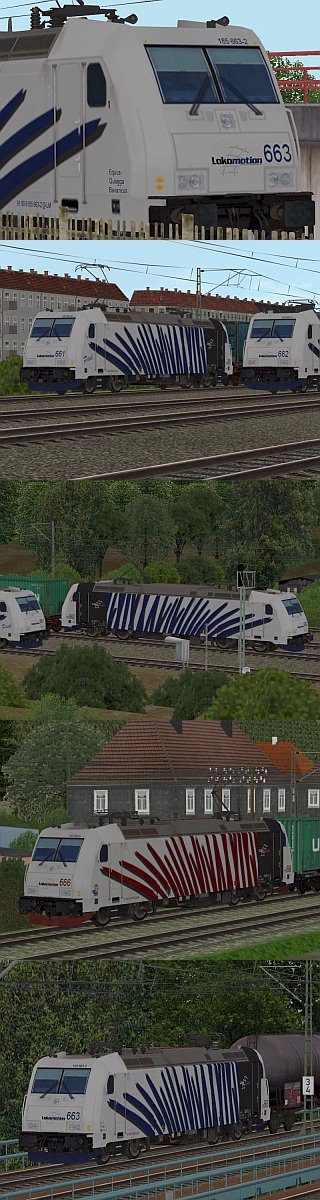 Im Set enthalten: Lokomotion_185-661-EpVI_DB1-SK2.gsb Installationspfad : Rollmaterial/Schiene/Lokomotiven Beschreibung: In diesem Set sind vier Lokomotiven der Baureihe 185.2 von Lokomotion enthalten. Einsetzbar ab Epoche VI Einige Technische Daten Achsfolge: Bo´Bo´ Besonderheiten: realistische Fahreigenschaften Auch gelistet als V60NDB10149 Trend |