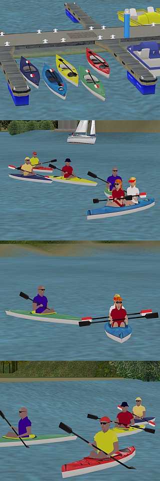 Beschreibung: Egal ob im Strandbad am Meer oder am Baggersee: Wo sommerlicher Badebetrieb herrscht, werden sie gerne benützt, die Badeboote vom Verleiher, zum Paddeln, oder auch zum Antrieb per pedes. Das Set besteht aus fünf Kajak-Paddelbooten als Rollmaterial, und fünf unbesetzten Paddelbooten, die als Immobilie einsetzbar sind. Details zu den Modellen: Das Rollmaterial verfügt über eine, bzw. zwei animierte Paddlerfiguren. Zwei der Modelle sind nicht mit Spurlage mittig, sondern je um einen Meter nach links, bzw. rechts versetzt konstruiert. Dadurch ergibt sich ein schöneres Bild, wenn die Boote im Pulk hintereinander fahren. Hinweise: Bei den Booten vom Typ Immobilie lässt sich via