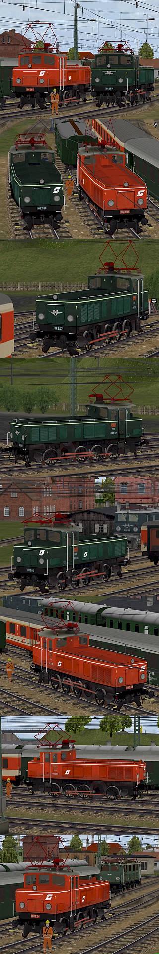 Beschreibung: Mit der fortschreitenden Elektrifizierung der ÖBB-Strecken in den fünfziger Jahren war auch die Überspannung vieler Bahnhofsgleise, wo vornehmlich Verschubbewegungen stattfanden, geplant. So entstand Bedarf an neuen, zugkräftigen Elektro-Verschublokomotiven. Die ÖBB bestellten zwölf Lokomotiven, die Reihenbezeichnung wurde mit 1062 festgelegt. Alle zwölf Lokomotiven wurden im Jahr 1955 ausgeliefert. So wie ihre Vorgängerserien hat sich auch die Bauart 1062 sehr gut bewährt. Die Reihe 1062 wurde - als letzte Normalspur-Stangenloktype - 1993-95 ausgeschieden, die 1062.07 verblieb als betriebsfähige Nostalgielok. Technische Daten: LüP: 10.820 mm Im Set enthalten: Rollmaterial: OBB_1062_gr.gsb OBB_1062_or.gsb Resourcen\Rollmaterial\Schiene\Lokomotiven\ Details zu den Modellen: Die Lokomotiven verfügen über realistische Fahreigenschaften, Beleuchtungsfunktion ab EEP3, und über automatischen Spitzensignalwechsel bei Änderung der Fahrtrichtung. Der Stangenantrieb ist vorbildnahe dargesgtellt. Eine Fahrerfigur kann via Schieberegler/Kontaktpunkt gedreht und ausgeblendet werden. Die Modelle verfügen über eine via Schieberegler/Kontaktpunkt 3-fach änderbare Lokomotivnummer. Das grüne Modell ÖBB 1062.07 trägt das ältere ÖBB-Flügelradlogo, sodass dieses Set im Prinzip sechs Lokomotivmodelle enthält, die sich durch die Nummer, bzw. bei einem Modell durch das Logo unterscheiden. Die Modelle wurden für EEP6 classic konstruiert. Es ist daher möglich, dass einzelne Funktionen in älteren Versionen/Plugins von EEP nicht oder nur eingeschränkt funktionieren. Die Modelle wurden zur Erzielung einer besseren Performance konvertiert. Dem Set liegt eine Beschreibung im PDF-Format bei. Hinweis: auch gelistet als V60NFF10055 Trend |