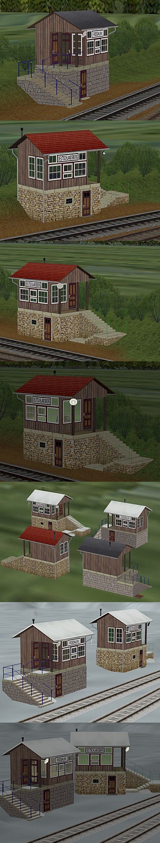 Beschreibung: Dieser Stellwerk-Typ wurde vermutlich zur Zeit der Donau-Monarchie für die Strecken der k.k. Südbahn-Gesellschaft entworfen. Bei der Südbahn-Gesellschaft wurden Stellwerke damals auch als „Weichentürme“ bezeichnet. Diese kleinen Stellwerke waren teilweise in leicht geänderter Form mehrmals an den Strecken der damaligen Südbahn-Gesellschaft bzw. in deren Nebenbahnnetz verbaut. Das Stellwerk „Rodaun“ wurde südlich von Wien errichtet. Es stand an einer Überland-Straßenbahnlinie, die vor der Jahrhundertwende 1900 als Dampfstraßenbahn eröffnet und die 1967 eingestellt wurde. Das Stellwerk „Deutschlandsberg“ wurde in der Weststeiermark errichtet und ist heute noch als Baudenkmal erhalten geblieben. Lieferumfang (Modellnamen in EEP): Resourcen\Immobilien\Verkehr\Bahnhoefe\ Stw_Deutschlandsberg.gsb Stw_Deutschlandsberg_wi.gsb Stw_Rodaun.gsb Stw_Rodaun_wi.gsb Hinweise Da man diese Gebäude meist nicht sofort abriss, als sie