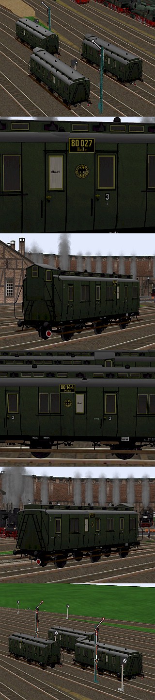 Beschreibung: Im Königreich Preußen waren die Eisenbahnen vor 1880 bis auf wenige Ausnahmen nicht in Staatsbesitz, sondern Eigentum privater Investoren. Nach der Verstaatlichung der Großen Privatbahnen stellte sich der Wagen- und Lokomotivpark der KPEV noch ganz uneinheitlich dar. Dadurch, dass jede Privatbahn nach ihren eigenen Vorgaben ihren Fahrzeugpark beschafft hatte, stand der KPEV nur ein bunt gemischtes Sammelsurium von vielen unterschiedlichen Fahrzeugen zur Verfügung (heute würde man sagen Splittergattungen). Aus wirtschaftlichen Erwägungen war die KPEV gezwungen eine umfassende Vereinheitlichung anzustreben. Beginnend mit den Normalien von 1878 wurden diese Beschaffungsgrundsätze im Laufe der Jahre immer weiter entwickelt und an die sich ändernden Bedürfnisse angepasst. Mit der weiteren Bearbeitung wurden die Normalien in „Musterblätter“ umbenannt, neben der regulären Musterblättern gab es auch Fahrzeuge nach besonderen Zeichnungen, die bei entsprechendem Erfolg auch in die Musterblätter aufgenommen wurden. Außerdem gab es für besondere Einsatzzwecke Ergänzungen der Musterblätter, die mit einem Index versehen wurden. Technische Daten: Die im vorliegenden Set enthaltenen Abteilwagen der Bauart "C3tr pr-04"sind nach dem Musterblatt Ib11; von 1904 gestaltet und haben folgende Merkmale. Von dieser Bauart (ehemalige 4.Klasse) wurden an die KPEV insgesamt ca. 10300 Wagen nach mehreren Musterblättern geliefert, die Wagen besitzen bei der DRG Scheibenräder und wurden auf Bahnstrecken in Deutschland eingesetzt. Die Wagen dieser Gattung besitzen Vereinslenkachsen (Radstand 7,5 m), die Enden sind mit Aufstiegsleiter bzw. Bremserhaus ausgerüstet und sie besitzen in der Regel 2 Aborte (WC-Anlage). Farbgestaltung und Bezeichnung sind dem Original nachempfunden, die Wagennummern sind aus dem am Vorbild orientierten Nummernschema frei gewählt. Lieferumfang: 3 Modelle RollmaterialSchienePersonenwagen als gsb: - DRG-C3tr_pr04-Halle_80-027_HB4, mit WC-Außentür, 7,5 m Radstand - DRG-C3tr_pr04-Magdeburg_80-014_HB4, ohne WC-Außentür, 7,5 m Radstand - DRG-C3tr_pr04-Mainz_80-144_HB4, ohne WC-Außentür, 7,5 m Radstand Nach der Installation der Wagen erfolgt sind diese in folgendem Verzeichnis wiederzufinden: Rollmaterial/Gleis/Wagen/Personenwagen Hinweise: Die Rollmaterialien haben folgende Slider-Funktionen: - Schlussscheibe – Ein- /Ausfahren der Tages-Zugschlusskennzeichnung an beiden Wagenenden Wagenbeleuchtung ab EEP3. Alle Modelle sind performanceoptimiert. auch gelistet als V60NHB40016 Trend |