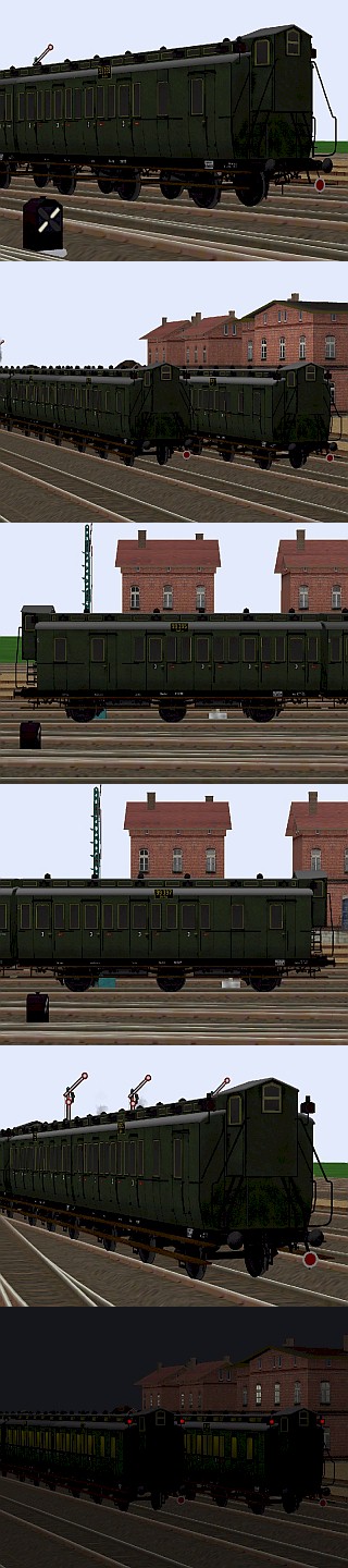 Beschreibung: Im Königreich Preußen waren die Eisenbahnen vor 1880 bis auf wenige Ausnahmen nicht in Staatsbesitz, sondern Eigentum privater Investoren. Nach der Verstaatlichung der Großen Privatbahnen stellte sich der Wagen- und Lokomotivpark der KPEV noch ganz uneinheitlich dar. Dadurch, dass jede Privatbahn nach ihren eigenen Vorgaben ihren Fahrzeugpark beschafft hatte, stand der KPEV nur ein bunt gemischtes Sammelsurium von vielen unterschiedlichen Fahrzeugen zur Verfügung (heute würde man sagen Splittergattungen). Aus wirtschaftlichen Erwägungen war die KPEV gezwungen eine umfassende Vereinheitlichung anzustreben. Beginnend mit den Normalien von 1878 wurden diese Beschaffungsgrundsätze im Laufe der Jahre immer weiter entwickelt und an die sich ändernden Bedürfnisse angepasst. Mit der weiteren Bearbeitung wurden die Normalien in „Musterblätter“ umbenannt, neben der regulären Musterblättern gab es auch Fahrzeuge nach besonderen Zeichnungen, die bei entsprechendem Erfolg auch in die Musterblätter aufgenommen wurden. Außerdem gab es für besondere Einsatzzwecke Ergänzungen der Musterblätter, die mit einem Index versehen wurden. In unserem Fall handelt es sich um eine kurzgekuppelte Variante für die Berliner Stadt- und Ringbahnen die mit den Zusätzen "a" (Wagen mit Bremserhaus) und "b" (Wagen ohne Bremserhaus) gekennzeichnet waren. Technische Daten: Die im vorliegenden Set enthaltenen Abteilwagen der Bauart "C3Pw pr-06"sind nach dem Musterblatt Ib8a/b; von 1909 gestaltet und haben folgende Merkmale. Von dieser Bauart (kombinierter 3.Klasse-Packwagen) wurden an die KPEV insgesamt 28 Wagen in zwei Bauausführungen geliefert, sie waren mit 3.Klasse-Wagen kurzgekuppelt, sie besitzen Scheibenräder und wurden auf den Vorortbahnen in Berlin eingesetzt. Der Gepäckraum erstreckte sich über 2 Abteilflächen, wodurch sich die verbleibenden Abteile und deren Sitzplatzzahl entsprechend reduzierte. Die Wagen dieser Gattung besitzen Starrachsen (Radstand 6,5 m), jeweils zwei sind miteinander kurzgekuppelt, die Enden sind mit Aufstiegsleiter bzw. Bremserhaus ausgerüstet und sie besitzen keinen Abort (WC-Anlage). Farbgestaltung und Bezeichnung sind dem Original nachempfunden, die Wagennummern sind aus dem am Vorbild orientierten Nummernschema frei gewählt. Einsatz: Epoche II Lieferumfang: 4 Modelle RollmaterialSchienePersonenwagen als gsb: - DRG-CPw3a_pr06-99-395_HB4, mit Bremserhaus, 6,5 m Radstand - DRG CPw3b_pr06-70-972_HB4, ohne Bremserhaus, 6,5 m Radstand - DRG-CPw3a_pr06-99-397_HB4, mit Bremserhaus, 6,5 m Radstand - DRG-CPw3b_pr06-70-977_HB4, ohne Bremserhaus, 6,5 m Radstand Nach der Installation der Wagen erfolgt sind diese in folgendem Verzeichnis wiederzufinden: Rollmaterial/Gleis/Wagen/Personenwagen Hinweise: Die Rollmaterialien haben folgende Slider-Funktionen: - Schlusslampen – Ein- /Ausfahren der Nacht-Zugschlussbeleuchtung - Schlussscheibe – Ein- /Ausfahren der Tages-Zugschlusskennzeichnung Wagenbeleuchtung ab EEP3. Alle Modelle sind performanceoptimiert. auch gelistet als V60NHB40020 Trend |