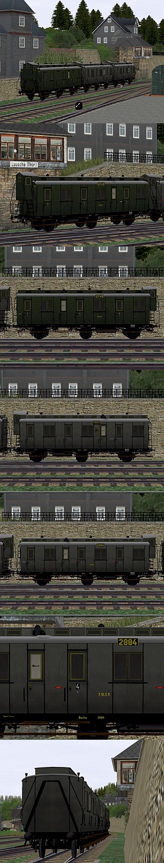 in Preußen eingesetzt. Die Wagen dieser Gattung besitzen Vereinslenkachsen (Radstand 7,5 m), die Enden sind mit Aufstiegsleiter bzw. Bremserhaus ausgerüstet und sie besitzen in der Regel 2 Aborte (WC-Anlage). Farbgestaltung und Bezeichnung sind dem Original nachempfunden, die Wagennummern sind aus dem am Vorbild orientierten Nummernschema frei gewählt. Einsatz: Epoche I / II Inhalt und Installation: Lieferumfang: 3 Modelle Rollmaterial\Schiene\Personenwagen als gsb: - PStEV-D3_pr04-Berlin_2884_HB4 - PStEV-D3_pr04-Berlin_2749_HB4 - PStEV-D3_pr04-Berlin_80-005_HB4 Nach der Installation der Wagen erfolgt sind diese in folgendem Verzeichnis wiederzufinden: >>//Rollmaterial/Gleis/Wagen/Personenwagen<< Hinweis: Die Rollmaterialien haben keine Slider-Funktionen. Wagenbeleuchtung ab EEP3. Alle Modelle sind performanceoptimiert. Einsetzbar unter EEP 2.43 bis EEP 6.1 auch gelistet als V60NHB40022 Trend |
