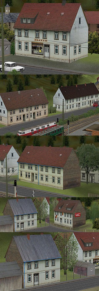 Beschreibung: In diesem Modellset sind typische Häuser mit Holzverschalung aus dem Harz enthalten. Es handelt sich dabei zum Teil um Nachbauten von originalen Gebäuden aus dem Bahnhofsbereich von Rübeland zum Zeitpunkt der DDR. Die typische Werbung ist diesem Bauzeitpunkt nachempfunden. Zum Lieferumfang gehören folgende Immobilien: Haus_Ruebeland_Cindy_JE1 Installationspfad: Immobilien/Domizil/Land/Harz Einsatz: Anlage Rübeland von Andreas Großkopf, Dorf, Kleinstadt, Stadtrand. Bahnhofsbereich. Hinweis: Die Modelle sind alle konvertiert und zum Teil im Eingangsbereich beleuchtet ab EEP. |