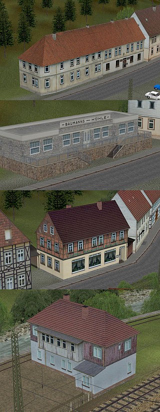 Beschreibung: In diesem Modellset sind typische Häuser mit Holzverschalung aus dem Harz enthalten. Es handelt sich dabei zum Teil um Nachbauten von originalen Gebäuden aus dem Bahnhofsbereich von Rübeland. Zum Lieferumfang gehören folgende Modelle: Baumannshoehle_Ruebeland_JE1.gsb Installationspfad: Immobilien \ Domizil \ Land \ Harz Einsatz: Anlage Rübeland von Andreas Großkopf oder Dorf, Kleinstadt, Bahnhofsbereich. Hinweis: Die Modelle sind alle konvertiert und verfügen teilweise über Beleuchtungsfunktion ab EEP 3 |