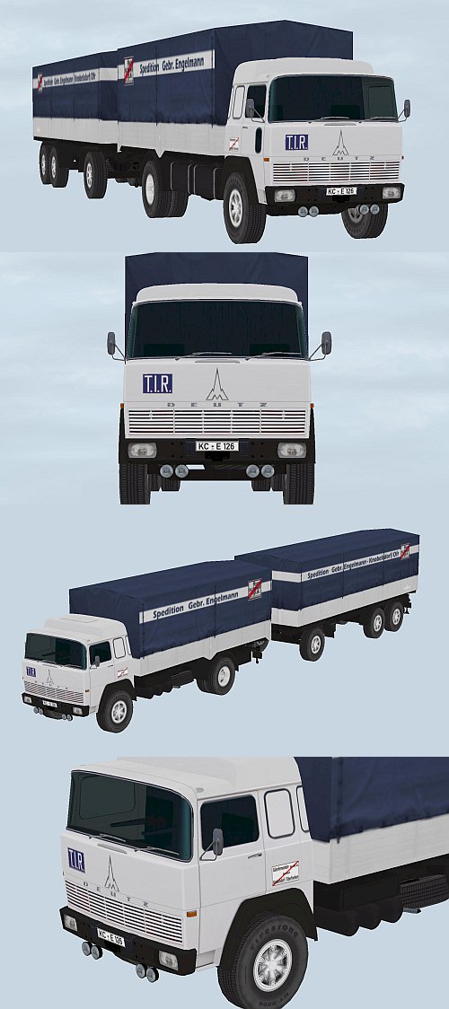 V-Triebwerke im Angebot. Die erste Bauserie verfügte über einen stets weisen Kühlergrill oder dieser war lackiert in Wagenfarbe. Die Blinker vorne waren eckig, das Logo, ein stilisiertes "M" und das "Ulmer Münster" an der Front mittig über dem Grill angebracht. Der Schriftzug "Deutz" wurde schon bald durch "Magirus Deutz" abgelöst. 1973 kam die auffälligste Modellpflege, der Kühlergrill war nun markanter geriffelt und schwarz oder in Wagenfarbe. Die eckigen Blinker mussten den neuen "Ochsenaugen-Blinkern" weichen. Das stilisierte Logo wanderte auf den Grill, zusätzlich war die verbaute Motorversion ablesbar. 1975 fusionierten schließlich Fiat, OM, Lancia, UNIC, und Magirus Deutz zur IVECO. Für einige Zeit wurden die Magirus-Fahrzeuge nun mit den Fahrerhäusern von Fiat ausgerüstet. Im Set enthalten ist: MD_170_D_15-S02_ANH_Engelmann_JE1 MD_170_D_15-S02_LKW_Engelmann_JE1 MD_170_D_15-S02_ANH_Engelmann_FW_JE1 MD_170_D_15-S02_LKW_Engelmann_FW_JE1 MD_170_D_15-S02_ANH_Engelmann_IMO_JE1 MD_170_D_15-S02_LKW_Engelmann_IMO_JE1 Die Rollmaterialien sind alle ab EEP3 beleuchtet, die Räder lenk- und drehbar. Die Immobilien sind ohne Funktion, lediglich an den Anhängern lässt sich die Deichsel durch anklicken jeweils um 90° nach rechts und links schwenkbar. Die Konvertierung ist gestattet, wird aber ausdrücklich nicht empfohlen. Fehlerhafte Darstellung in EEP7+ werden nicht per kostenlosen Update behoben. Viel Freude an den Modellen wünscht Jürgen Engelmann ! |