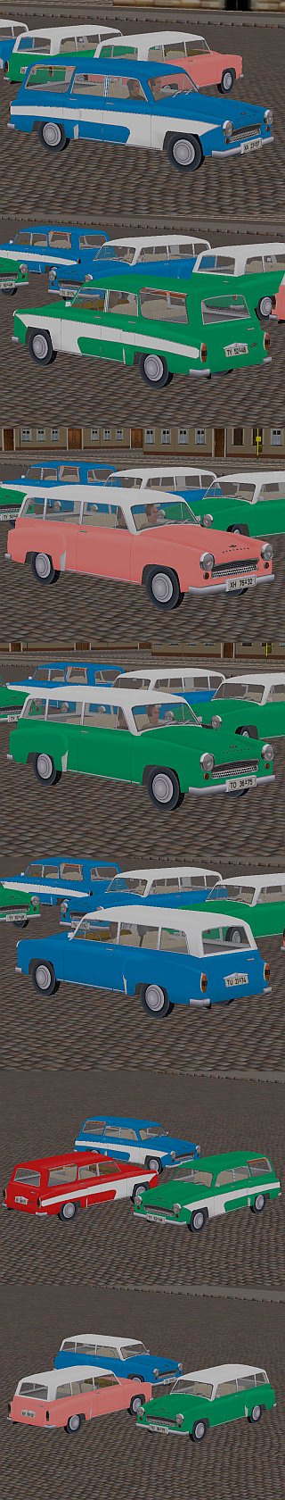 Im Set enthalten sind 6 Modelle als Rollmaterial und 6 als Immobilie Resourcen\Rollmaterial\Strasse\PKW Wartburg311CampingBlauWeiss_JS2 Resourcen\Immobilien\Verkehr\PKW Wartburg311CampingBlauWeiss_JS2 Beschreibung: Das Set besteht aus insgesamt 6 Modellen, je 3 verschiedenfarbigen Wartburg 311 Kombi und 3 verschiedenfarbigen Wartburg 311 Camping. Die Modelle verfügen über je eine Fahrer- und Beifahrerfigur. Die Figuren können per Kontaktpunkt jeweils einzeln angesteuert werden und sind versenkbar. Je nach EEP Version haben alle Modelle eine Blink- und Bremslichtfunktion sowie drehbare Räder mit Lenkfunktion. Die Modelle sind außerdem mit einer Rauchfunktion ausgestattet. Alle Modelle sind im Set auch als Immobilien (ohne Figuren) enthalten. Die Immobilien sind mit Scheinwerfer und Rücklicht beleuchtet und man kann die Vorderräder einlenken. Technische Daten: Produktionszeitraum: 1955-1967 Beschreibung zum Vorbild: Der Wartburg 311 wurde im VEB Automobilwerk Eisenach von 1955 bis 1965 hergestellt. Es gab diverse Weiterentwicklungen, bei der äußerlich kaum Veränderungen vorgenommen wurden. Später produzierte man das Fahrzeug als Wartburg 312 noch bis 1967. Hinweise: Einsatz ab Epoche lV Einsetzbar bis EEP 6.1, ab EEP 3 beleuchtet. auch gelistet als V60NJS20007 Trend |