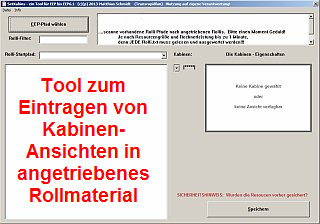 Wichtig: die Anwendung dieses Programmes durch den User unterliegt der eigenen Verantwortung ! Beschreibung: Mit diesem Tool kann die Kabinenansicht für angetriebene Rollis geändert werden. Es stehen nur die Kabinen zur Verfügung, die Sie in Ihrem EEP haben. Zu empfehlen ist das Anlegen einer Sicherungskopie von den Resourcen, um jederzeit den Originalzustand wiederherstellen zu können. Das Tool wird im EEP Ordner Resourcen\Anlagen\installiert. Das Tool installiert sich zunächst in die EEP Umgebung. Später ist es durchaus möglich die Programmdatei an anderer Stelle auf der Festplatte abzuspeichern und zu starten. Um das Tool bedienen zu können, lesen Sie bitte die beiliegende ausführliche SetKabins.pdf Viel Freude beim Nachrüsten der Kabinenzuweisungen von Rollmaterial ! Einsatz: als Hilfsmittel bis EEP6 |
