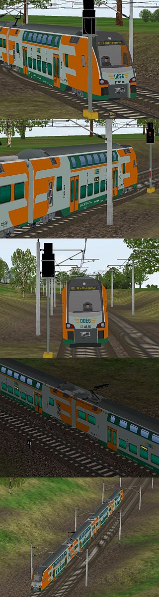 im Set enthalten sind vier Modelle: ODEG_ET445_1.gsb Resourcen\Rollmaterial\Schiene\Triebwagen Beschreibung: Der Doppelstocktriebzug der ODEG (Ostdeutsche Eisenbahn Gesellschaft) hat eine Länge von 102 m und besteht aus 2 Triebköpfen und 2 Mittelwagen. Der Aufbau erfolgt in der Reihenfolge _1, _2, _3 und _4 Beide Triebköpfe sind angetrieben. Der Triebzug hat