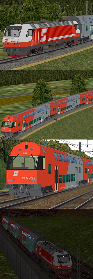im Set enthalten sind vier Modelle als Zug: Lieferumfang: OBB_1822_003_MK1.gsb Resourcen\Rollmaterial\Schiene\Lokomotiven Doppelstockwagen: OBB_Bmpz_dl_902_MK1.gsb Resourcen\Rollmaterial\Schiene\Personenwagen Beschreibung: Die E-Lok OBB 1822 sollte die erste Lok für den grenzüberschreitenden Verkehr über den Brenner nach Südtirol sein. Da das Projekt nur halbherzig durchgeführt wurden, sind nur 5 Stück gebaut worden. Der dritte Stromabnehmer ist für die Brennerstrecke konzipiert. Mittlerweile sind die E-Loks,die 1996 angeschafft wurden, nicht mehr in Betrieb. Die Doppelstockwagen Bmpz-ds und Bmpz-dl wurden ebenfalls 1996 in großen Stückzahlen für den Regionalverkehr angeschafft. E-Lok und Doppelstockwagen sind für Vmax 140 km/h vorgesehen. Hinweise: Realistische Fahreigenschaften Technische Daten: E-Lok 1822: Achsfolge Bo'Bo' Doppelstockwagen: Gleisbogenradius 150 m Auch gelistet als V60NMK10201 Trend |