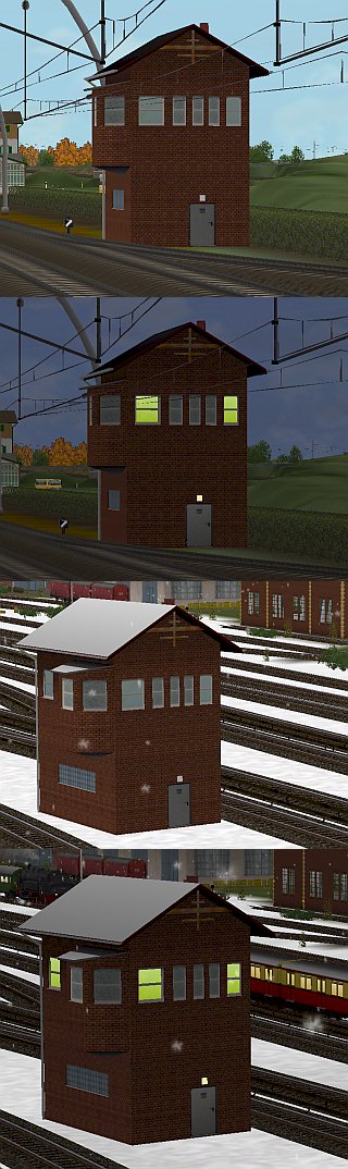 Im Set sind die Immobilien enthalten: Kl-Stellwerk_MK2 Sommermodell Kl-Stellwerk-wi_MK2 Wintermodell Resourcen\Immobilien\Stellwerk Beschreibung: Für das Modell stand ein sehr altes und verwaschenes Foto aus den 1920er Jahren zur Verfügung. Die wesentlichen Konturen des Gebäudes waren jedoch noch erkennbar. Das Stellwerk eignet sich für mittlere und kleine Bahnhofsanlagen sowie für S-Bahnanlagen. spezielle Hinweise: Die Modelle sind frei aufstellbar. Entsprechend der jeweiligen EEP-Version sind die Gebäude mit Rauch- / Lichtfunktion ab EEP3 ausgestattet. |