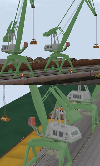 Beschreibung: Die Kräne sind fahrtüchtig, voll beweglich und verfügen über folgende Funktionen: - 360 Grad drehbar Diese Funktionen können ab EEP5 auch per Kontakt ausgeführt werden. Die Kräne sollten auf dem mitgelieferten Gleis