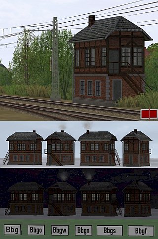 Beschreibung: Stellwerk in rotem Klinker, Das Obergeschoß verfügt über transparente Fensterscheiben. Zur Ausgestaltung liegen TexEx fähige Schilder bei, welche einfach davor gesetzt werden. Bestandteile des Sets: Stellwerk_2_pw1.gsb Die Modelle sind teilweise ab EEP3 beleuchtet. Einsetzbar unter EEP2.43 - EEP6 Ab EEP3 mit Rauchfunktion. Viel Spaß mit den Modellen wünscht der Autor |