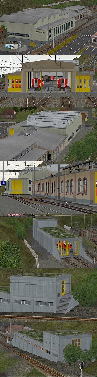 Beschreibung: Nachbau der Hallen des Depot Poschiavo der Rhätischen Bahn. Für die 1908 eröffnete Berninabahn bedeutet Poschiavo den wichtigsten Bahnhof südlich des Passes. Im Depot mit angegliederter Werkstätte werden die Gleichstrom-Triebfahrzeuge der Rhätischen Bahn gewartet. Der Stützpunkt des Bahndienstes mit Fahrleitungsdienst betreut die gesamte etwa 60 km lange Bahnlinie. Im Jahre 1962 wurde das Stationsgebäude neu erbaut, von 1969 bis 1972 das Depot erweitert. Bestandteile des Sets: 9 Gleisobjekte: Poschiavo_1000_Grubeneinsatz_pw1.gsb 6 Immobilien: Poschiavo_1800_Fahrdraht_pw1.gsb Dem Set liegt eine Beschreibung bei. Einsetzbar unter EEP2.43 - EEP6 Viel Spaß mit den Modellen wünscht der Autor |