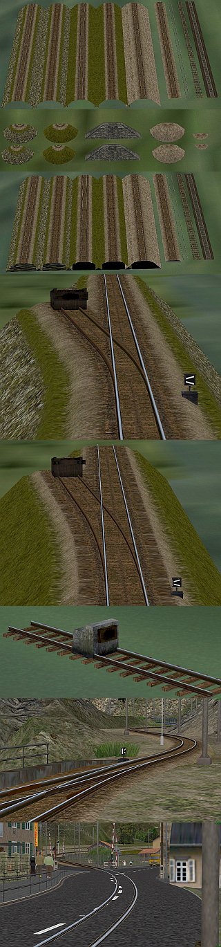 Hinweis: einsetzbar ab EEP6.1 Beschreibung: Im Set enthalten sind 18 Gleisstile mit 2 dazugehörigen Prellbockvarianten für die Meterspur, einem Prellbock für die Regelspur, SBB Weichenlaternen sowie 10 Dammabschlüsse als Immobilien. 18Gleisstile: 3011_SBB-1000mm_Stahl_Schotterdamm_pw1.def 10 Immobilien zum Abschluß der Splines mit Damm: SBB-1000-Felsd_Abschluss_pw1.gsb SBB-1435-Felsd_Abschluss_pw1.gsb Für den elektrifizierten Betrieb werden die Fahrleitungsmasten und die Joche aus dem Set: Fahrleitungsmaste und Joche der SBB, AM1418_TREND benötigt, da die Oberleitung der SBB von der EEP Standardoberleitung abweicht. Hinweis: Bedingt durch die hohen Gleisstil_ID´s wird EEP Classik vorausgesetzt, eine Installation unter EEP6 ist möglich, jedoch müssen dann die Gleisstil_ID gegen noch unbelegte ID aus den freien ID Bereichen 201-250 , 601-650 oder 951-1000 getauscht werden. Viel Spaß mit den Modellen wünscht der Autor |