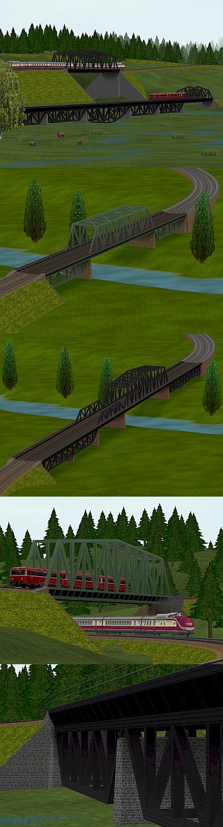 Jedes Baukastenset ist eigenständig einsetzbar ! Beschreibung: Dies ist das erste Set zu einer Reihe von Stahlfachwerk- Eisenbahnbrücken, die alle zusammen einen Bausatz ergeben. Es enthält verschiedene Balkenbrücken je in den Farben schwarz und grün, sowie viele verschiedene Brückenköpfe und Brückenpfeiler. Die Brücken und deren Zubehör dieses Sets wie auch die aller anderen Sets dieser Reihe sind miteinander vielfältig zu kompletten Brückenstrassen kombinierbar; zudem ist es möglich, passend zu den Brücken beliebig gebogene Auffahrtrampen mit frei wählbaren Steigungen zu gestalten. Für die Verlegung einer Oberleitung empfiehlt sich die Verwendung der ZickZack-Oberleitung, die als Gratismodell hier erhältlich ist: Artikel: VR1fr002, zusammen mit dem im Set befindlichen Brückenmasten. Näheres siehe in der beigefügten pdf-Dokumentation. Lieferumfang: Es sind 459 Modelle enthalten Hinweise: Ab EEP 5 Plugin 2 bzw. EEP 6 Bahndammköpfe passen zu den Bahndammsplines der Gleis1435-Reihe Einsatz: Ab Epoche 2 Hinweis: Diese Modelle sind für EEP bis Version 6 konstruiert und optimiert. auch gelistet als RT2401 Trend |