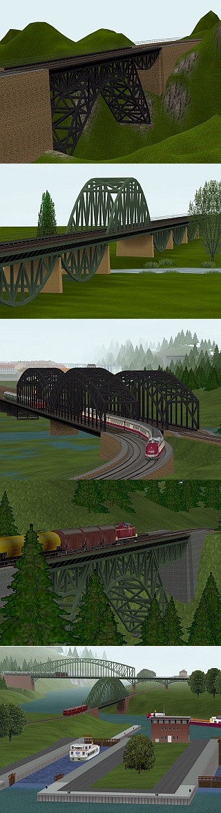 Jedes Baukastenset ist eigenständig einsetzbar ! Beschreibung: Dies ist das zweite Set zu einer Reihe von Stahlfachwerk-Eisenbahnbrücken, die alle zusammen einen Bausatz ergeben. Es enthält verschiedene Bogenbrücken je in den Farben schwarz und grün, sowie viele verschiedene Brückenköpfe und Brückenpfeiler. Die Brücken und deren Zubehör dieses Sets wie auch die aller anderen Sets dieser Reihe sind miteinander vielfältig zu kompletten Brückenstrassen kombinierbar; zudem ist es möglich, passend zu den Brücken beliebig gebogene Auffahrtrampen mit frei wählbaren Steigungen zu gestalten. Für die Verlegung einer Oberleitung empfiehlt sich die Verwendung der ZickZack-Oberleitung, die als Gratismodell hier erhältlich ist: Artikel: VR1fr002, zusammen mit dem im Set befindlichen Brückenmasten. Näheres siehe in der beigefügten pdf-Dokumentation. Lieferumfang: Es sind 483 Modelle enthalten Hinweise: Ab EEP 5 Plugin 2 bzw. EEP 6 Bahndammköpfe passen zu den Bahndammsplines der Gleis1435-Reihe Einsatz: Ab Epoche 2 Hinweis: Diese Modelle sind für EEP bis Version 6 konstruiert und optimiert. auch gelistet als RT2402 Trend |