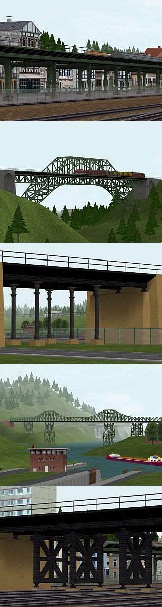 Jedes Baukastenset ist eigenständig einsetzbar ! Mit diesem Bausatz wird gleichzeitig ein Update für die Besitzer vom Baukasten Set 4 geliefert. Dieses Update ist dann nötig, wenn die Kunden dieses Set auch benutzen wollen. Bitte beachten Sie die Meldungen beim Modelinstaller, es sind mehrere Installationen nötig und zusätzlich sollte das Update im Extraordner gestartet werden. Beschreibung: Dies ist das fünfte Set zu einer Reihe von Stahlfachwerk-Eisenbahnbrücken, die alle zusammen einen Bausatz ergeben. Es enthält verschiedene Brücken und Stahlstützen je in den Farben schwarz und grün, sowie viele verschiedene Brückenköpfe und –pfeiler. Die Brücken und deren Zubehör dieses Sets wie auch die aller anderen Sets dieser Reihe sind miteinander vielfältig zu kompletten Brückenstrassen kombinierbar; zudem ist es möglich, passend zu den Brücken beliebig gebogene Auffahrtrampen mit frei wählbaren Steigungen zu gestalten. Für die Verlegung einer Oberleitung empfiehlt sich die Verwendung der ZickZack-Oberleitung, die als Gratismodell hier im Bereich Gratis erhältlich ist. Artikel: VR1fr002, zusammen mit dem im Set befindlichen Brückenmasten. Näheres siehe in der beigefügten pdf-Dokumentation. Enthalten ist auch ein Update für das Set 4 dieser Baureihe. Mit diesem Update werden die Talgroßbrücke, die Stahlpfeiler sowie deren zugehörige Fundamente im unteren Teil ihrer Konstruktion um 10 cm angehoben. Die Gleishöhe bleibt dabei unverändert. Das Update dient der Vereinheitlichung der Geometrien mit den Modellen aus dem Set 5. Es enthält nur die veränderten Dateien und ist daher nur auf ein schon installiertes Stahlfachwerkbrücken-Baukasten-Set 4 anwendbar. Dies sollte auch geschehen, falls das Set 4 noch nachträglich installiert wird. Lieferumfang: 664 Modelle; Übersicht in der Dokumentation Die komplette Liste der Datei- u. Anzeigenamen ist in der Tabelle der pdf-Dokumentation Hinweise: Ab EEP 5 Plugin 2 bzw. EEP 6 Einsatz: Ab Epoche 2 Hinweis: Diese Modelle sind für EEP bis Version 6 konstruiert und optimiert. auch gelistet als V52NRT20006 Trend |