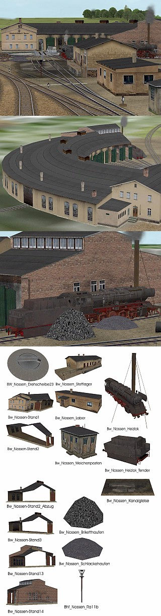 Bahnbetriebswerk Nossen (Sachsen) Zum Lieferumfang gehören: in Gleisobjekte\Gleise\Bahnhoefe\Nossen\ BW_Nossen_Drehscheibe23 Bw_Nossen_Kanalgleise - Gleisstil "unsichtbares Gleis" ! in Immobilien\VERKEHR\Bahnhoefe\Nossen\ Bw_Nossen_Briketthaufen in Rollmaterial\Schiene\Lokomotiven\ Bw_Nossen_Heizlok - Die Lokomotive ist nicht für den Streckendienst geeignet ! in Rollmaterial\Schiene\Tender\ Bw_Nossen_Heizlok_Tender BLOCKS\Track_objects_track\Bw_Nossen Beschreibung zum Vorbild: Das Set beinhaltet die Anlagen und Gebäude des ehemaligen Bahnbetriebswerk Nossen (Sachsen). Achtung Hinweis zum Block: Den Prinzipaufbau der Drehscheibenanlage mit den Gleisobjekten können Sie